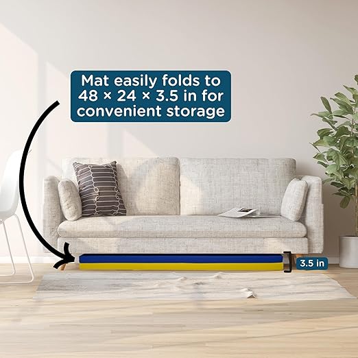 - FOLDING GYM MAT FOR EASY STORAGE: This mat quickly unfolds for play time and folds for storage just as quickly. Each of it's 5-sections fold taking the size down from 48 x 48 x 1.5 inches to just 24 x 48 x 4 inches.