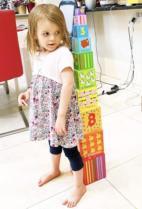 - Solid, strong and multifunctional nesting and sorting cube blocks with bright rainbow colour design printed in wood. It has more educational functions than any other stacking cubes and nesting toys. You can stack the cups up to make a 115 cm tall tower and nest them inside each other at 15.5 centimetres in the colourful box for easy storage.