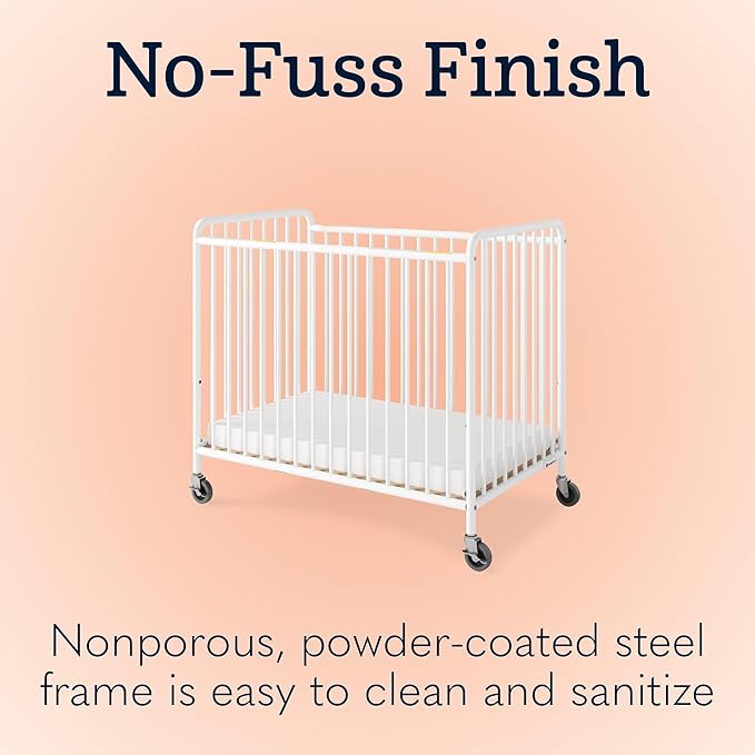 Foundations Chelsea Clearview Metal Compact Daycare Crib, 3" Casters, Compact Mini Size, Easy to Clean Durable Finish, Adjustable to Two Heights Mattress Board (White)