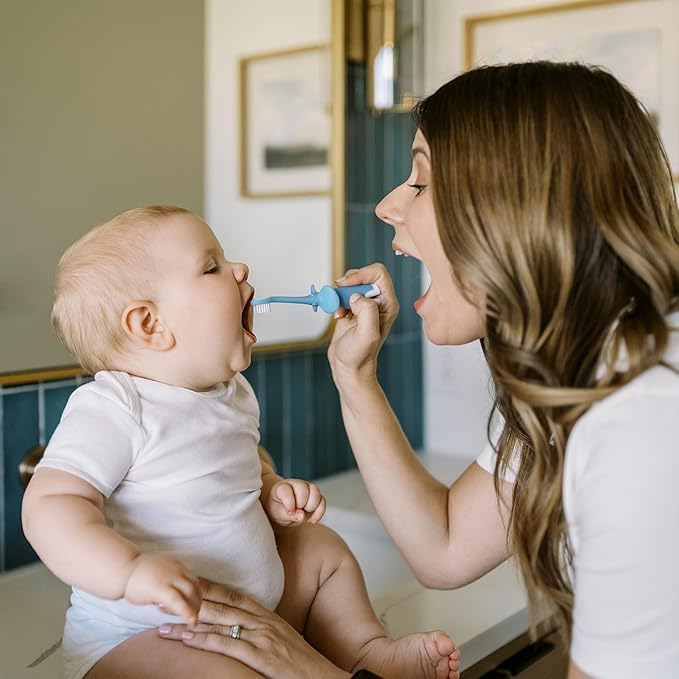 - CONVENIENT COUNTERTOP STORAGE. The elephant ears let baby set the brush down without surface contact or the wide base lets you securely store it upright.