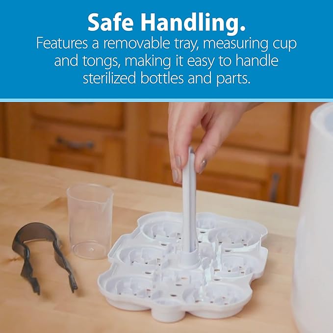 - INCLUDES MEASURING CUP AND TONGS. Adding new water is easy with the included measuring cup, and the included tongs allow you to safely handle bottles and parts after sterilization.