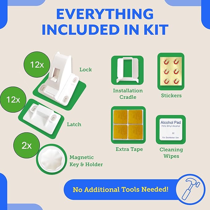 - Complete Child Proofing Kit: Take baby safety to the next level with our comprehensive kit, which includes 12 magnetic cabinet locks, 2 keys, 12 latches, an installation cradle, and extra TESA adhesive tapes