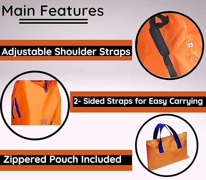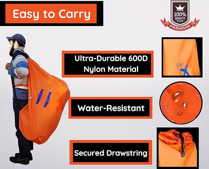 - BRIGHT ORANGE AND EASY TO SPOT - this bag universally fits most single, double and jogger strollers. This bag measures 48" x high X 25" wide X 17" deep. It helps to protect contents from dirt and damage. It is essential for travel. . Folds up into a handy travel pouch. Easy to slip into your handbag or hand baggage when not in use. Experience will tell you weight is everything when traveling - Avoid bulky or padded wheelie stroller travel bags