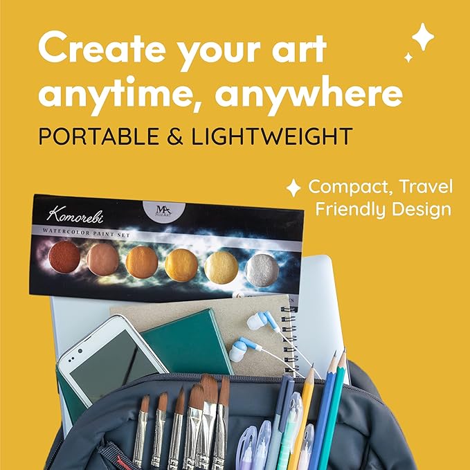 MozArt Supplies Komorebi Metallic Watercolor Paint Set – Set of 6 Shimmery Colors – Portable and Lightweight – For Artists, Students, Kids & Hobbyists - Metallic Watercolor Paints