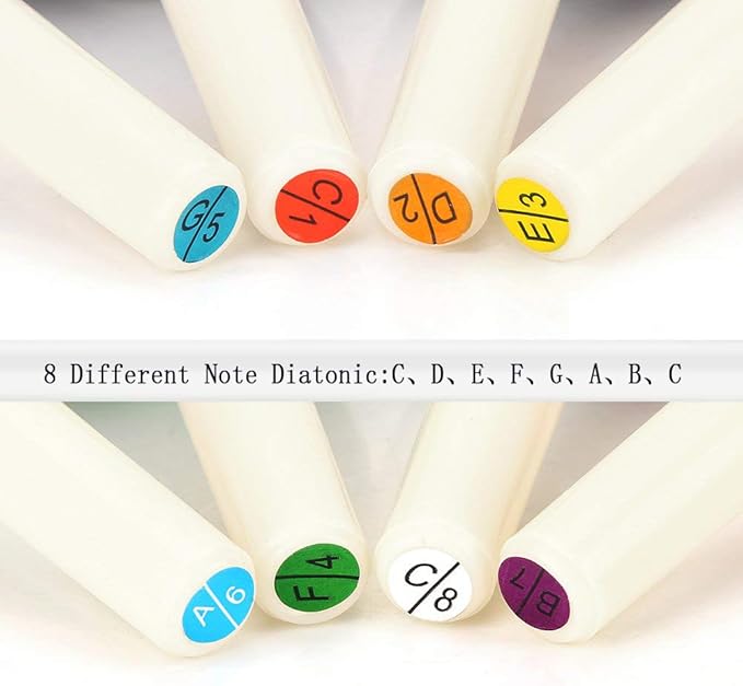- ♪【PERFECT MUSICAL INSTRUMENT】- Set of 8 tuned metal hand bells with notes Middle C, D, E, F, G, A, B, High C ; color coded and marked on resin handles with corresponding note and scale position.