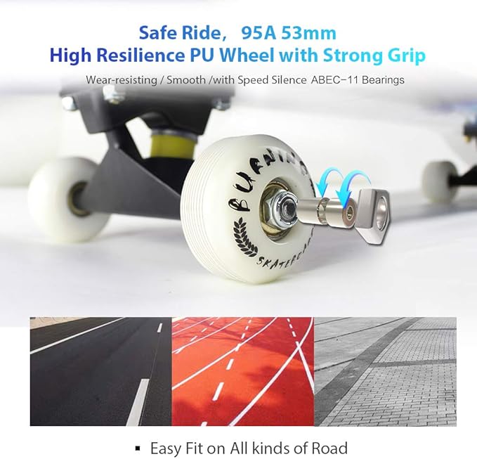 - 【EASY TO STOP】 When you want stop , just put one of your foot on the ground to stop it. Or you can lean your body to reverse direction to slow down the speed then stop your skateboard.