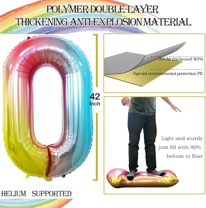GOER 2 Pcs 42 Inch Rainbow Foil Balloons Number 0 for 10th 20th 30th 40th 50th 60th 70th 80th 90th 100th Birthday Party Supplies Anniversary Decorations