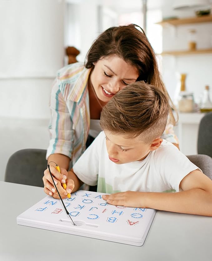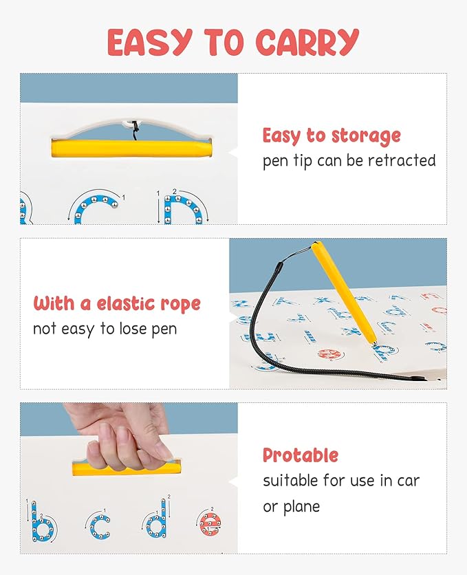 - Great Tool to Teach Writing: Children using the stylus pen help them stay on the stroke - and they love to hear and see the metal beads pop up as they go. Then they can use their finger to erase each letter. With the sequence stroke and path direction instruction guide next to each alphabet character