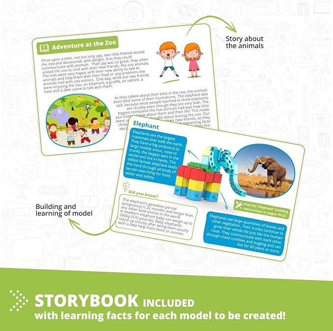 - STORYBOOK & ACTIVITIES: Includes a storybook with learning facts for each model to be created. Activities include challenges on creativity, spatial coordination and math. Introduce the fundamentals of engineering and STEM.