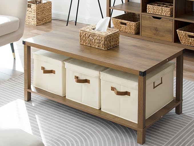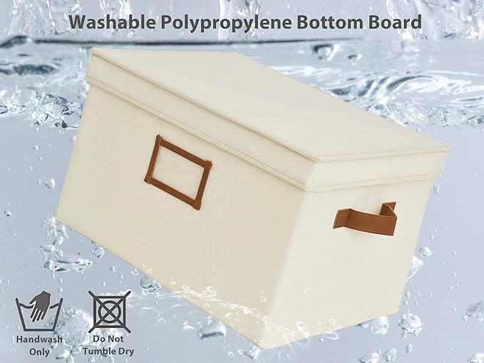 StorageWorks Storage Bins with Lids, Decorative Storage Boxes with Lid and PU Handles, Foldable Storage Baskets for Closet, Shelves, Stackable, Ivory, Jumbo, 3-Pack