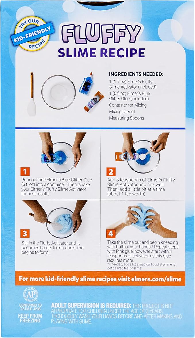 - Kit includes: 2 tubes of Elmer's Fluffy Slime Activator (1.7 fl. oz. each); 1 bottle of Pink Translucent Color Glue (5 fl. oz.), 1 bottle of Blue Glitter Glue (6 fl. oz.)