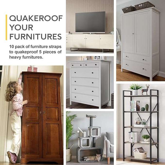 - Widely Application To Anchor Different Furniture: The anti-tip furniture straps includes all hardware including screws, adjustable straps, brackets, wall anchors. It is widely used to anchor furniture such as bookshelf, bookcase, cabinet, drawer, dresser, TV stand, armoires, wardrobes, any baby furniture and leaning mirror wall anchors. Ideal for protecting children and pets from the dumping of furniture