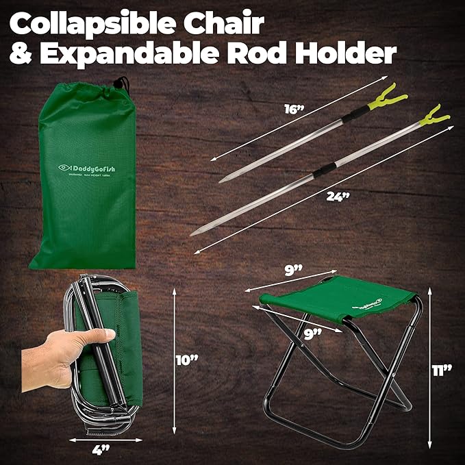 • COLLAPSIBLE CHAIR AND ROD HOLDER - Kids have a place to rest wherever they go. The rod holder keeps the fishing pole off the ground and minimizes the chance of accidental damage.