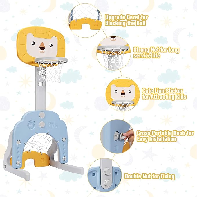 - 【3-in-1 Activity Center】 This kids basketball hoop has three sports to play, including golf game, basketball game and soccer goal game. It also comes with 1 basketball,1 soccer ball,2 golf balls and 1 golf club. By playing by themselves or with friends, children can gain unlimited joy and develop motor skills!