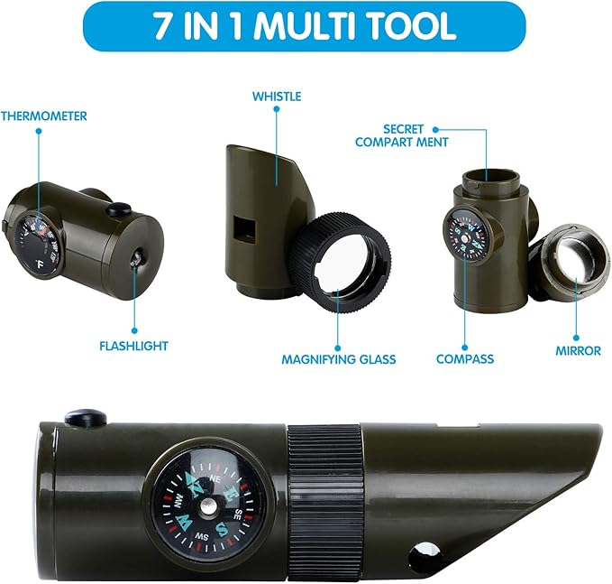 - COMPLETE EXPLORER KIT FOR KIDS - Full Bug Catcher Kit For Kids includes Safari Costume Kids x1, Safari Hat x1, Kids Binoculars x1, Kids Backyard Bugs Book x1, Telescopic Butterfly Net x1, Magnifying Glass x1, 7 IN 1 Multi Tool x1(which contains a flashlight, thermometer, compass, whistle, magnifying glass, mirror and secret compartment), Kids Bug Catching Kit with Magnifier x1, Tweezer x1, Bug Tong x1, Organization backpack x1. Wonderful outside toys for kids ages 4-8 outdoor toys for kids 8-12.