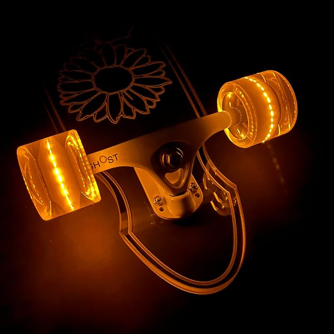 - Glow at Night: This longboard features durable light-up wheels that activate through motion, creating a visible trail during nighttime rides. With a balanced 70mm 78A construction, these ghost longboards glide smoothly on different surfaces. Its sleek build makes it ideal for those seeking clear long boards, whether for city cruising or relaxed outdoor use.
