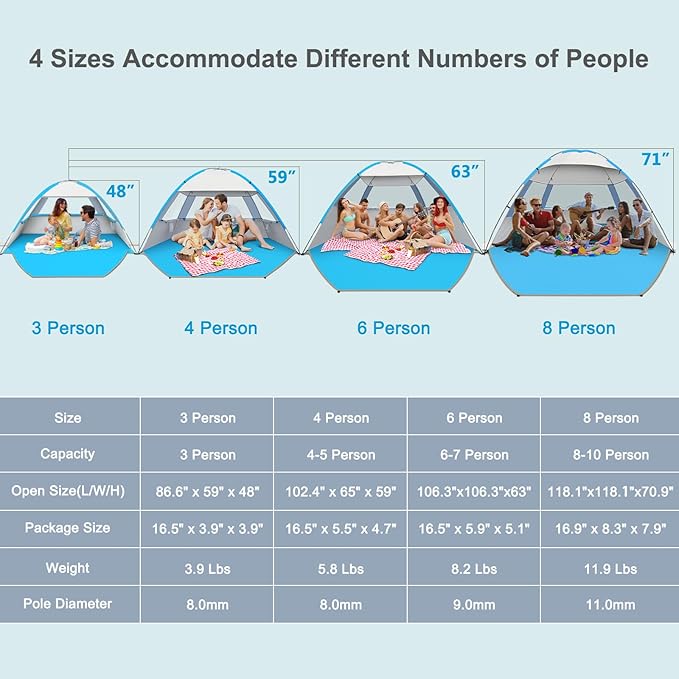 - Super Large Space: Size of 86.6"L x 59"W x 48"H, 30% bigger than other beach tents at similar price, fits 3-4 person. It provides a comfortable space for family and friends on the beach