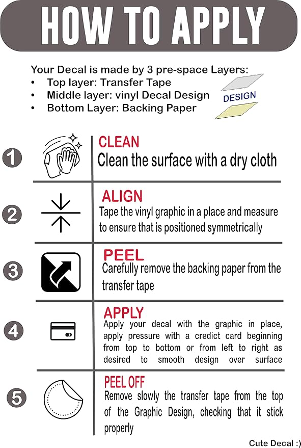 - EASY INSTALLATION - DYI product, precut with precision HD cutting equipment just peel and stick, apply slowly to a flat surface. Simply clean your surface, ensuring it's oil-free, peel off the sticker, and slowly apply it using our transfer film. Hassle-free installation for a flawless finish.