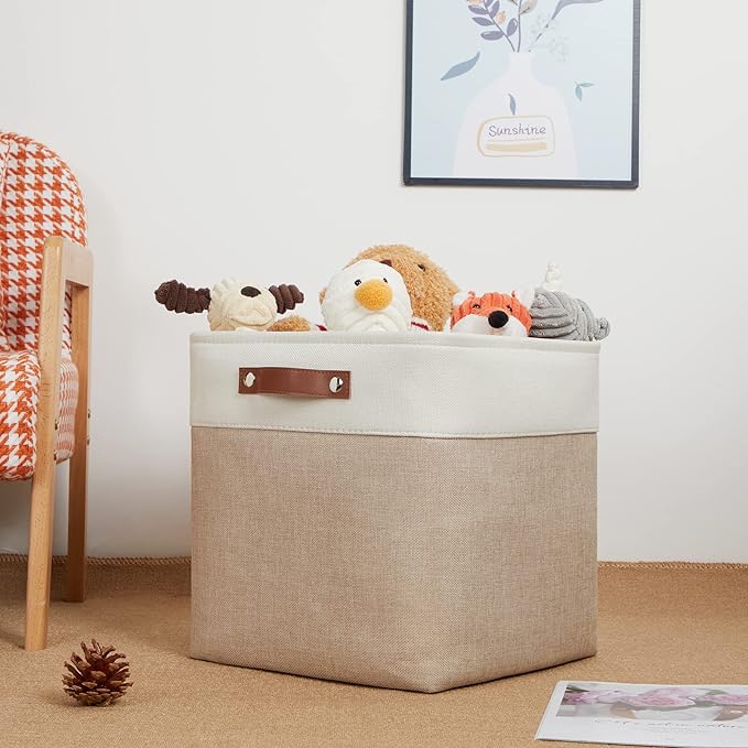 DULLEMELO Fabric Storage Cubes,13 inch Cube Stroage Bins for Empty Gift Basket,Toy Nursery Storage Linen Closet Organizers and Storage Baskets Shelves Bins(White&Khaki)