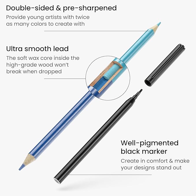 - Set Includes 12 Double-Ended Colored Pencils: Our coloring book set also included colored pencils for kids, one pencil sharpener, one eraser, and one black marker.