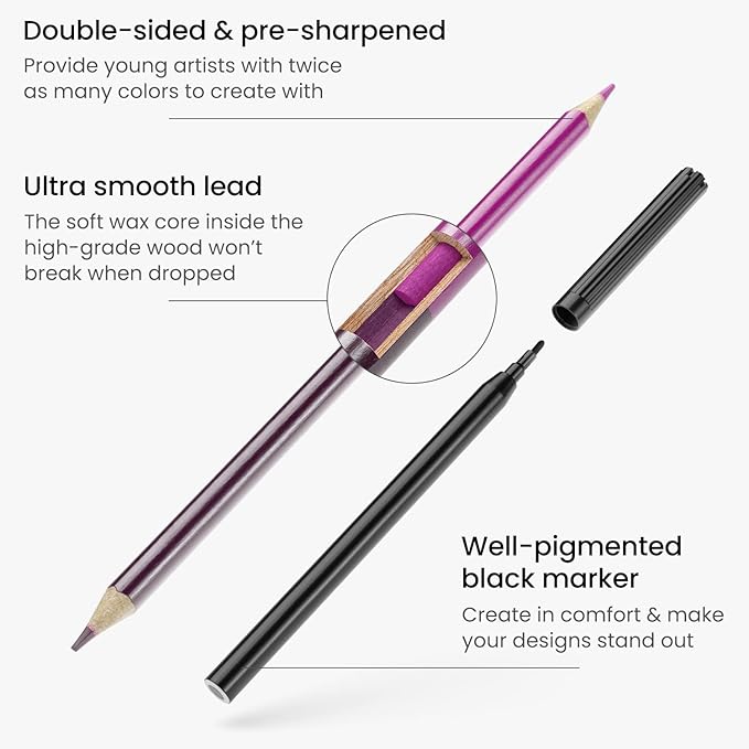 - Set Includes 12 Double-Ended Colored Pencils in 24 Colors: Our coloring book set also included colored pencils for kids, one pencil sharpener, one eraser, and one black marker.