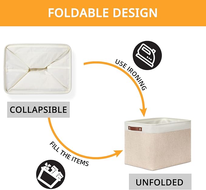 DULLEMELO 2-Pack Large Storage Baskets for Organizing 16"x12"x12" Canvas Fabric Storage Basket Bins With Leather Handles for Shelf Clothes Empty Gift Basket (White&Khaki)