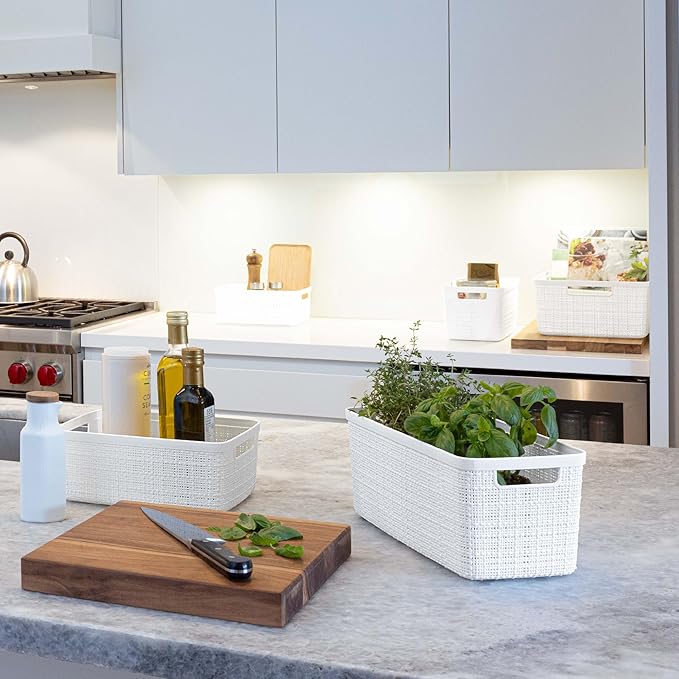 Curver Jute Decorative Plastic Organization and Storage Basket Perfect Bins for Home Office, Closet Shelves, Kitchen Pantry and All Bedroom Essentials, Slim, White, Set of 8