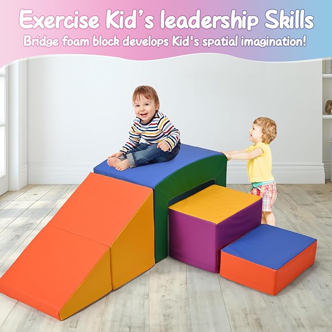 - TWO WAYS TO PLAY:The slope climbing toys in the toddler foam climbing blocks can be folded into a square or put down to use as a slide, which not only increases kid's interest but also creates building ability for them.Brightly colored foam blocks can not only be combined into various shapes, but also become seats for little princesses and princes!