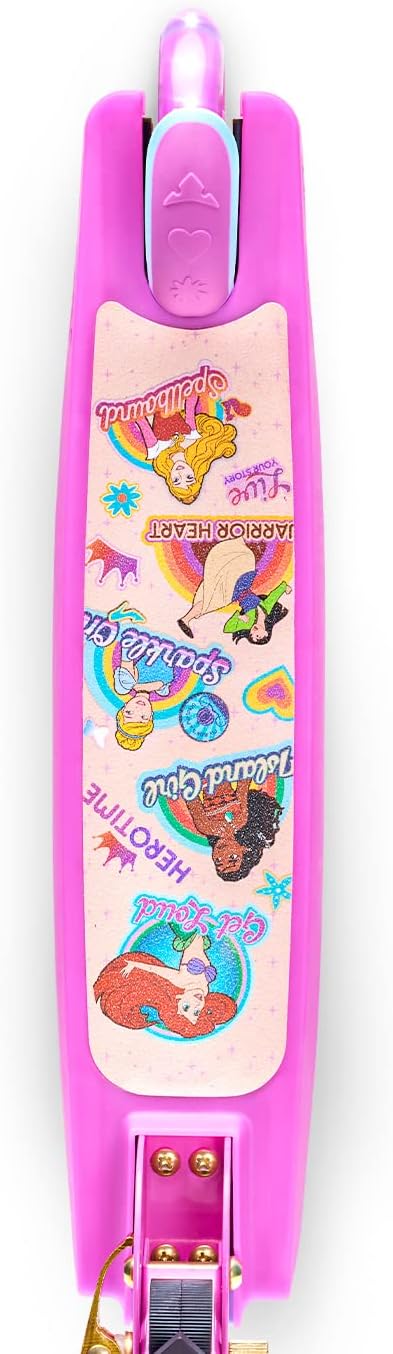 - DISNEY PRINCESS SCOOTERS: The deck features all of your favorite princesses while the stem is a stylish pink and blue showing off the Disney castle. This 2 wheel scooter comes with sparkling light up LED wheels and adjustable height handlebars.