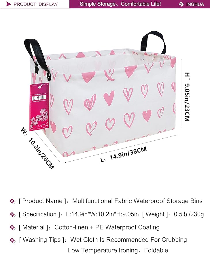 Rectangular Storage Basket Fabric Organizer Bin for Toys,Books,Clothes,Gifts,Pets-Perfect for Home,Office,Nursery,Dorm,Shelf(Rec-Pink hearts )