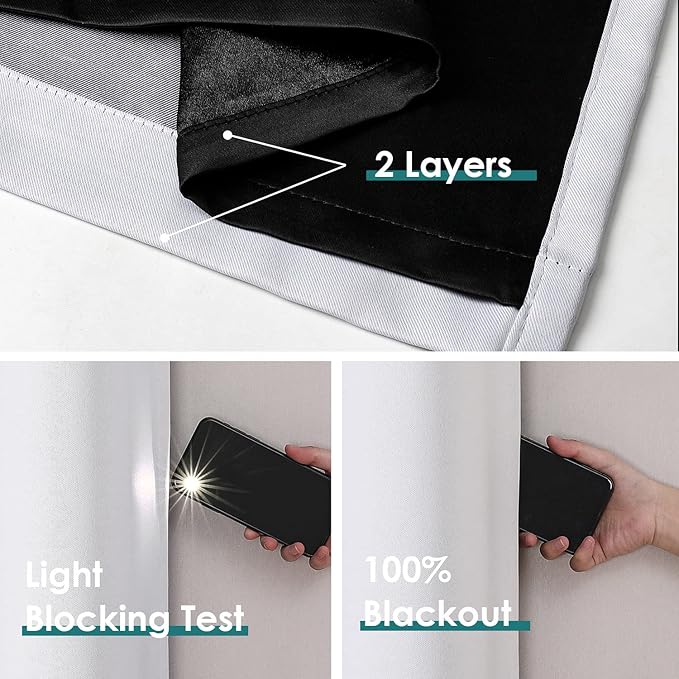 - 100% LIGHT BLOCKING: Double layer dark out bedroom curtains are thick enough to completely block out sunlight and UV to let no light come in. Bring you a full room darkening environment for good night sleep, afternoon nap and weekend lie-ins.