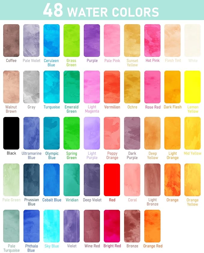 - 48 Rich Colors: This painting set contains a 48 paint palette including the primary colors and more.Easy to blend colors and dry fast, fading resistant and have excellent fluid.It is an ideal arts & crafts supply choice for outdoor sketching, creative interactive classroom activities, and other leisure art activities.