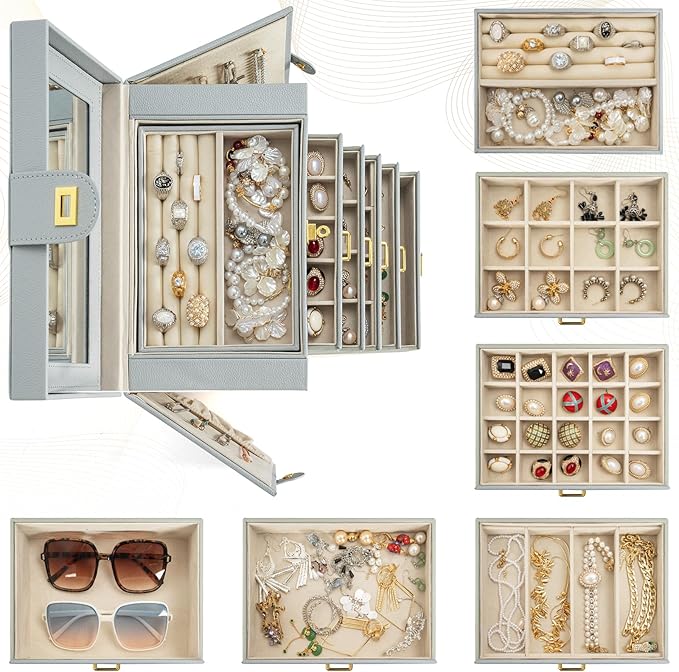 - 【LARGE CAPACITY】:With 6 versatile pull out drawers, this black huge jewelry box can store a lot of jewelry accessories, such as rings, earrings, necklaces, chains, bracelets, and so on. Soft pillows in the bottom drawer suit for storing watches. One deeper drawer is designed for sunglasses or large jewelries.