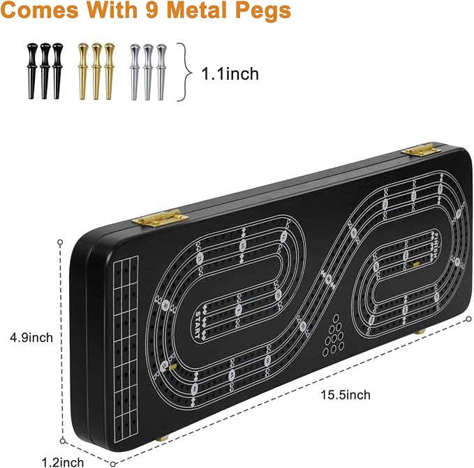 - 【Cribbage Board Game Set 3 Tracks】 Join together with friends and family to take part in this addictively fun board game! Plusvivo cribbage board has three tracks, Open the board to reveal two decks of cards and nine metal cribbage pegs (silver, gold, and black).