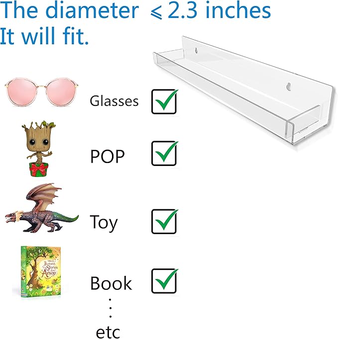 - Size&Packed: Depth is 2.3″, overall size 15″ x 2″ x 2.3″, total 4 packs.RORKIM has individually wrapped all clear wall shelves in protective film to ensure our clear acrylic racks are scratch-free.