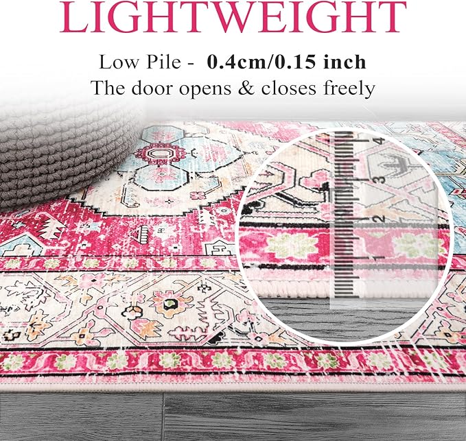 - Functional Lightweight Rug - Lahome ultra-thin rugs are made with everyday use in mind and high-traffic areas. 0.15 inches thickness allows for convenient placement in hallway, kitchen, entryway and underneath furniture. The door opens and closes freely
