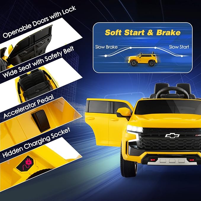 Costzon Ride on Car, 12V Licensed Chevrolet Tahoe Battery Powered Electric Vehicle w/ 2.4G Remote Control, High/Low Speed, Music, Lights, MP3/USB/FM, Spring Suspension, Electric SUV for Kids (Yellow)