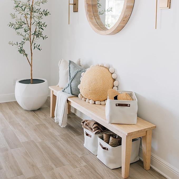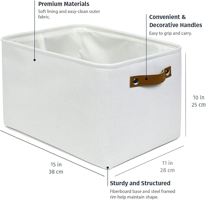 - Decorative Fabric and Vegan Leather – These versatile storage baskets for organizing your everyday life are made with a thick, high-quality fabric and fitted with leather handles to add a stylish touch to a living room, bedroom, office, or personal space.