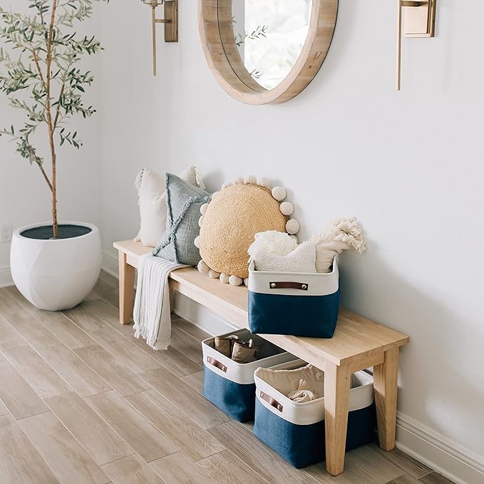 - Decorative Fabric and Vegan Leather – These versatile storage baskets for organizing your everyday life are made with a thick, high-quality fabric and fitted with leather handles to add a stylish touch to a living room, bedroom, office, or personal space.