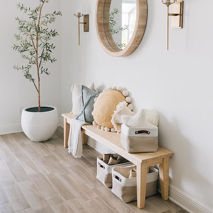 - Decorative Fabric and Vegan Leather – These versatile storage baskets for organizing your everyday life are made with a thick, high-quality fabric and fitted with leather handles to add a stylish touch to a living room, bedroom, office, or personal space.