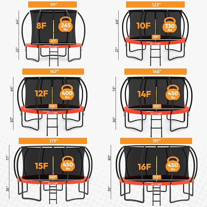 - SIZED FOR EVERY BACKYARD: Whether you have a cozy yard or wide-open space, we’ve got you covered. Available in 8 FT, 10 FT, 12 FT, and 14 FT trampoline sizes to fit your outdoor space perfectly. Jump into fun that fits just right.