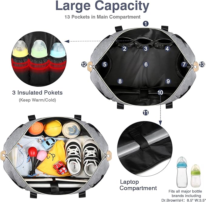 • Large Capacity & Multi-Pocket: Multifunctional pockets for newborn baby essentials including a main compartment, a front pocket, a back zipper pocket, 3 insulated pockets and 8 easy-access pockets inside for bottles, diapers, or wipes. Two sides pocket, wipes can be easily extracted from a hole in the outer layer. When you need to put something else, you can use velcro to prevent things from falling. Say goodbye to searching crazily in the bottom of your diaper bag for that one lost item.