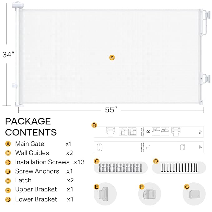 - Easy Hardware Installation: With the tools provided, you can have your new mesh retractable gate installed in minutes. Brackets, wall anchors, and screws make installation a hassle-free process. (Note: Not suitable for metal surfaces. When mounting to drywall, always anchor the screws into a stud for a secure and safe installation.)