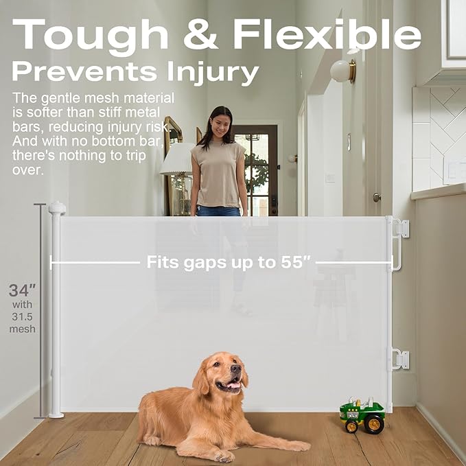 Cumbor 55" Wide Retractable Baby Gates for Stairs, Mom's Choice Award - Mesh Dog Gate for Doorways, Pet Safety Essential Fit for Baseboards, Wide Toddlers Gates for Hallways, Indoor & Outdoor, White
