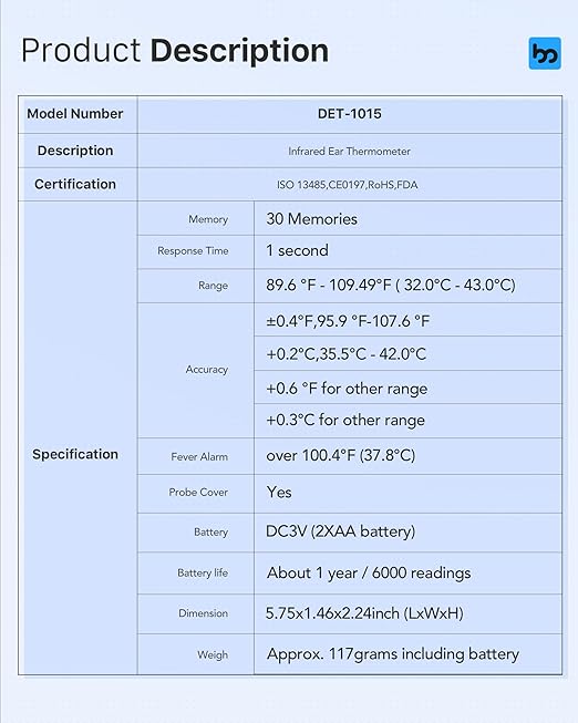 - Included Components : 1×Ear Thermometer, 2×AA Batteries, 24×Probe Covers, 1× Storage Bag, 1×Manual