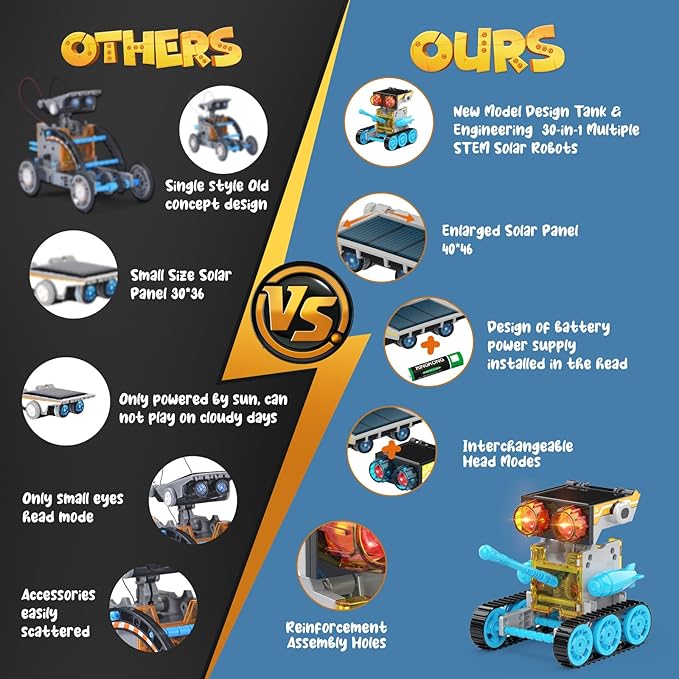 - Upgrade Design Features-Independently Wesfuner 2023 innovated and designed and upgraded STEM solar robots toys kits, the following 5 features optimization improvements: Two new concept shapes tank and engineering vehicle, 2 kinds of power source supply, enlarged solar panel area, 2 kinds of replaceable heads, large-size accessories and deepening the optimization and improvement of the installation hole, accurate track design, more firm, solve the problem that accessories are easy to fall off