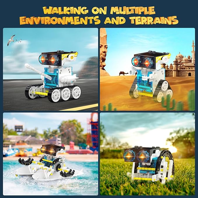 - Upgrade Design Features-Independently Wesfuner 2023 innovated and designed and upgraded STEM solar robots toys kits, the following 5 features optimization improvements: Two new concept shapes tank and engineering vehicle, 2 kinds of power source supply, enlarged solar panel area, 2 kinds of replaceable heads, large-size accessories and deepening the optimization and improvement of the installation hole, accurate track design, more firm, solve the problem that accessories are easy to fall off