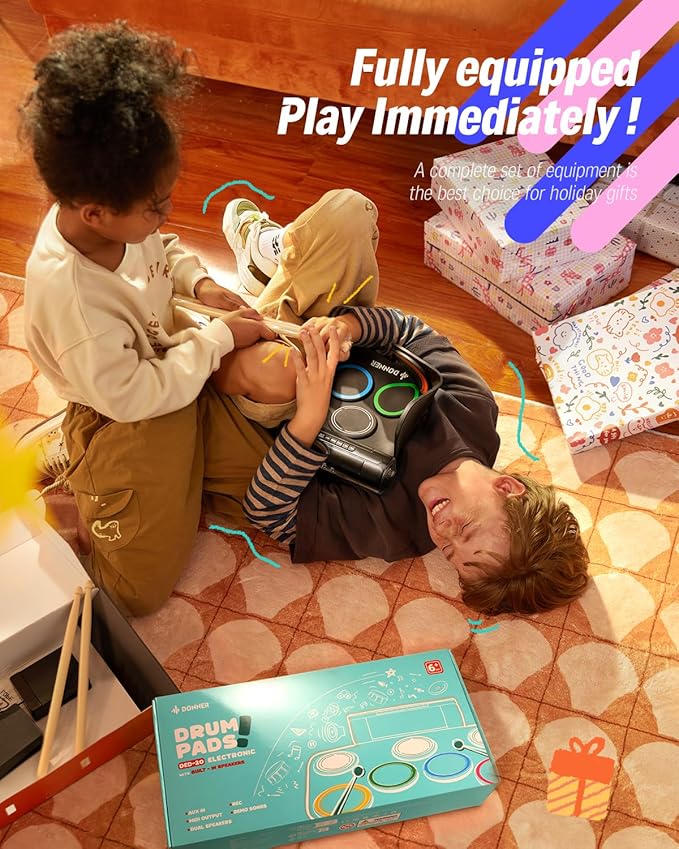 - 🎁[Ideal Music Enlightenment Toy Gift For Kids] You can send the DED-20R electric drum set for your kids, families, and friends as gifts for Birthdays or Christmas. It contents:1 x electronic drum pad(mobile power charging support), 1 x power adapter, 1 x USB data cable, 1 x 3.5mm audio cable, 1 x drum sticks, 2 x drum pedals. Any questions contact us.