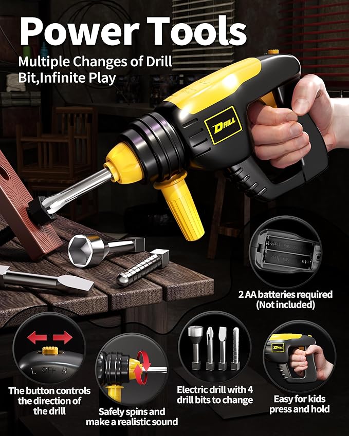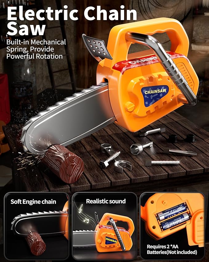 - 【Electric Saws & Drills】The chain of a toy chainsaw rotates at a uniform speed, which is safe for children! The toys drill comes with 4 interchangeable drill bits for different functions, it only requires 2AA batteries that simulate sound and movements, which is more attractive and develop kids' imagination.