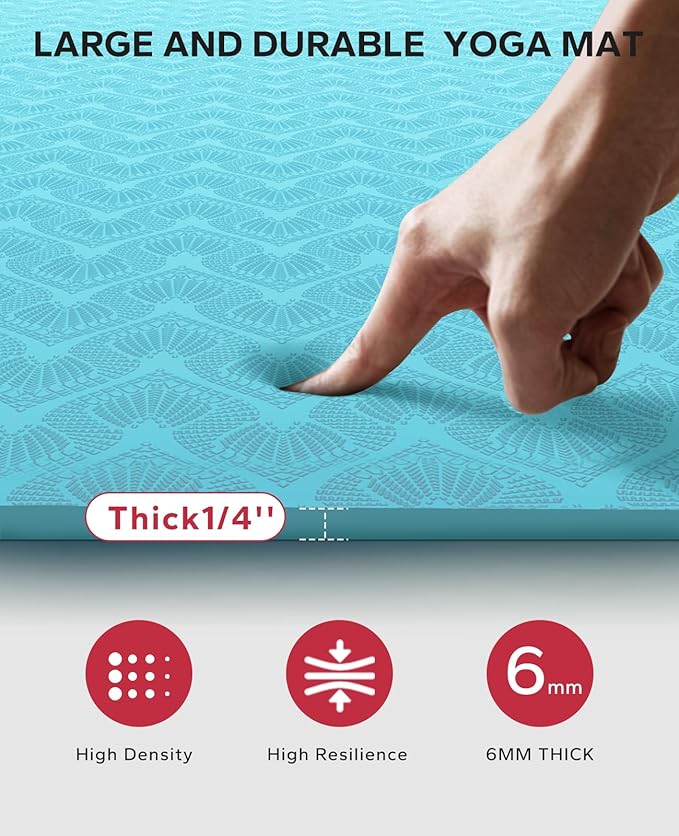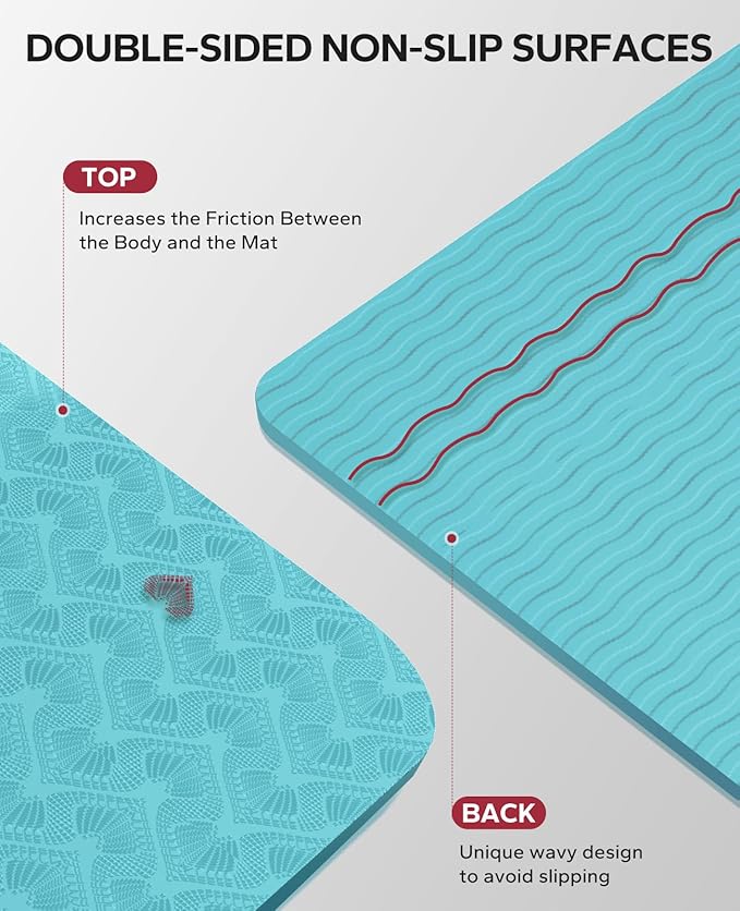 - ๐๐จ๐ฎ๐๐ฅ๐-๐๐ข๐๐๐ ๐๐จ๐ง-๐๐ฅ๐ข๐ฉ ๐๐๐ฌ๐ข๐ ๐ง: Our extra wide yoga mat features a double-sided non-slip surface to keep you stable and secure during your practice without worrying about slipping or sliding. The unique wave pattern on the bottom enhances grip on a variety of surfaces, ensuring your mat stays securely in place even during the most challenging yoga poses. Note๏ผNot for use on carpet